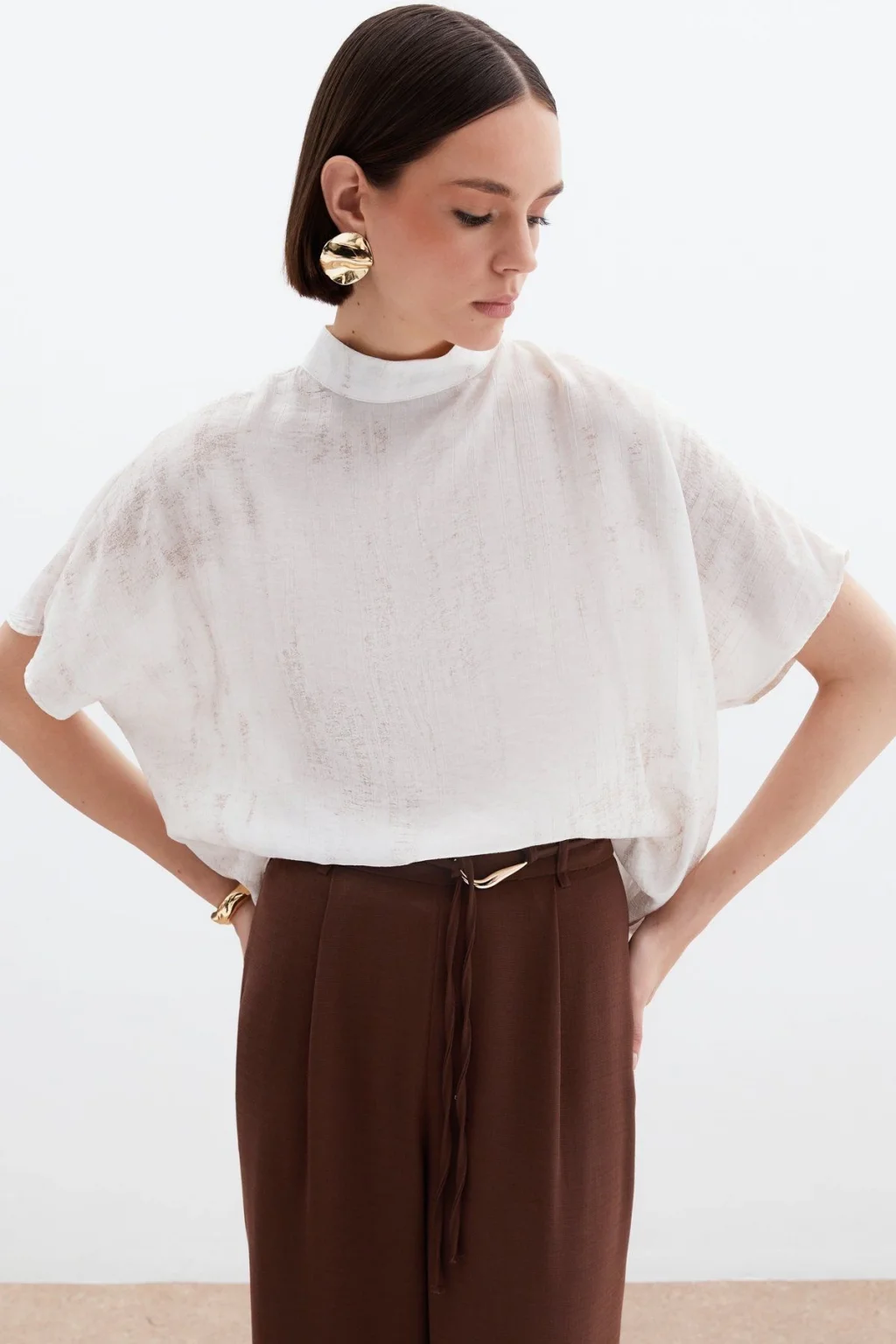 - Etnik desenleriyle dikkat çeken batık desenli salaş bluz, her mevsim rahatlıkla tercih edilebilir.; - İnce yapısı sayesinde hafif ve konforlu bir kullanım sunar; tüm sezonlarda ideal bir seçenek olur.; - Relaxed kalıbıyla vücudu sarmayan, özgürce hareket etme imkanı sağlayan tasarım.; - Standart boy uzunluğu ile farklı vücut tiplerine uyum sağlayarak şık bir görünüm kazandırır.; - Kadın ve kız kullanıcılar için tasarlanmış bu bluz, günlük giyimde rahatlık ve stil arayanların vazgeçilmezi haline gelir.; - Dokuma keten kumaşı sayesinde nefes alabilir yapıda olup, gün boyu ferahlık hissi verir.; - Günlük kullanıma uygun casual tarzıyla her ortamda rahatlıkla kombinlenebilir.; - Kısa kol boyu yaz ayları için idealdir; serin tutarken aynı zamanda modern bir görünüm sunar.