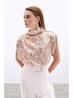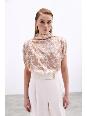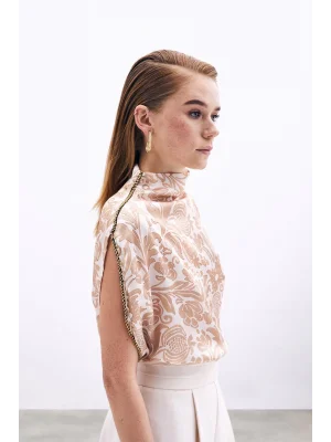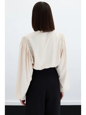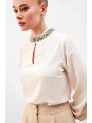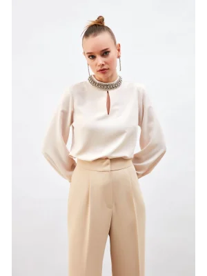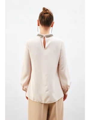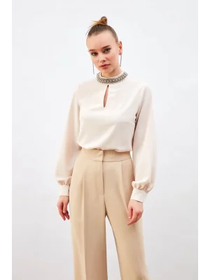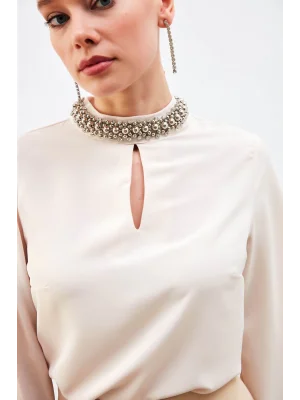 Yaka Aksesuarlı Bluz - Bej