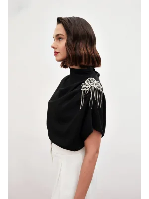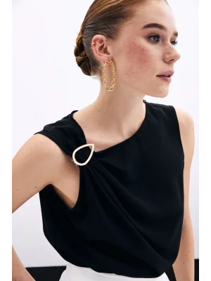 Tek Omuz Aksesuarlı Bluz - Siyah