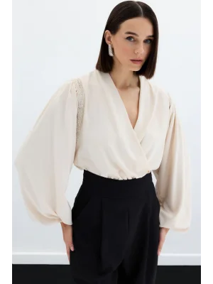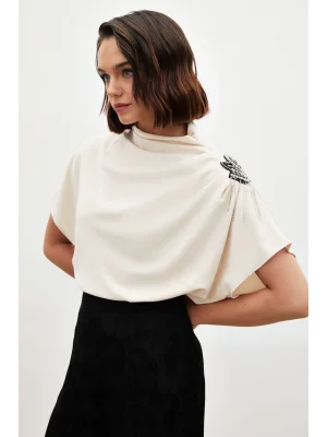 Aksesuarlı Yarasa Kol Bluz - Bej