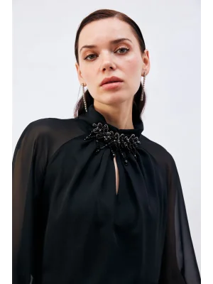 Yaka Aksesuarlı Bluz - Siyah