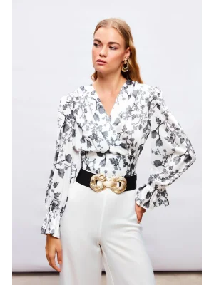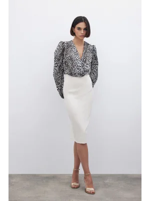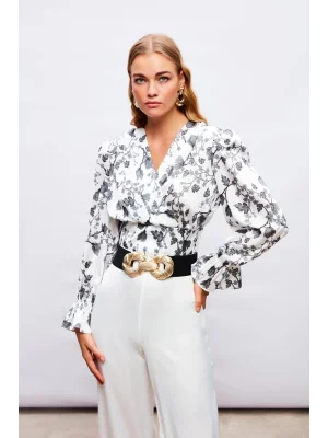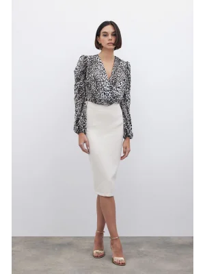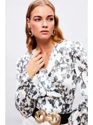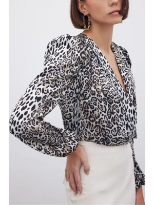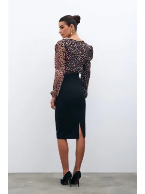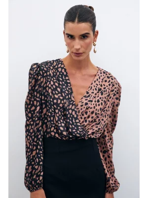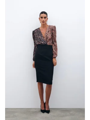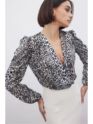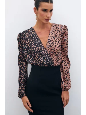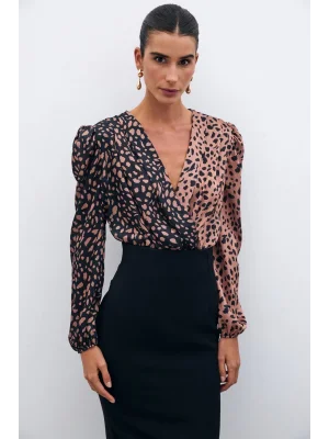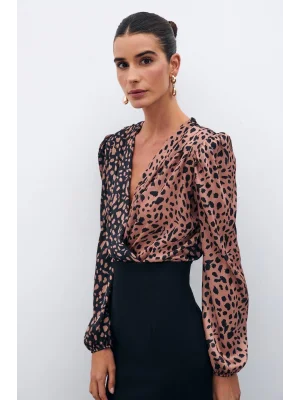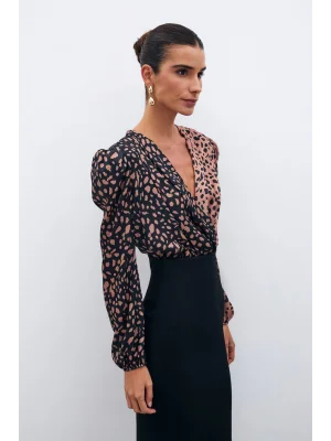 Kruvaze Desenli Bodysuit - Siyah-Camel