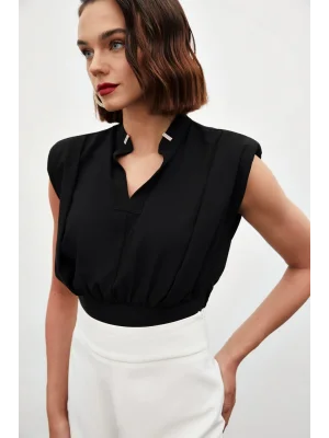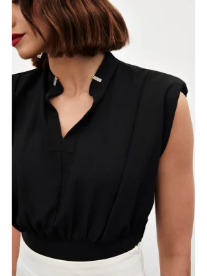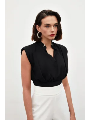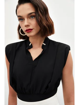 Yaka Aksesuarlı Kolsuz Bluz - SİYAH