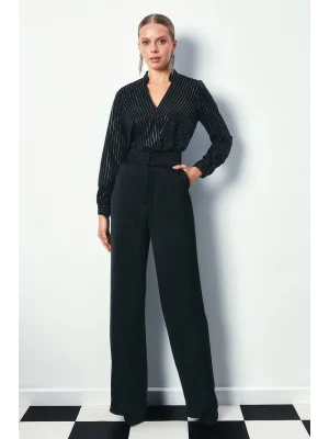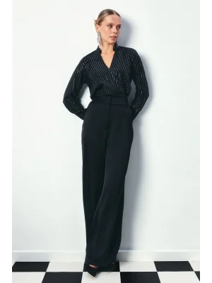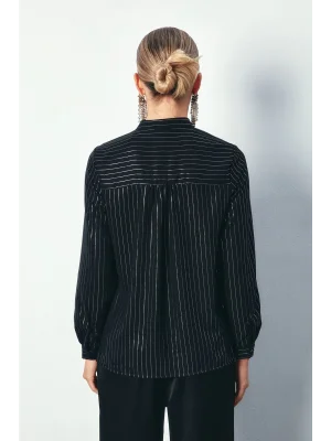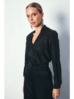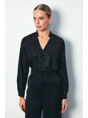 Kruvaze Parlak Çizgili Bluz - SİYAH