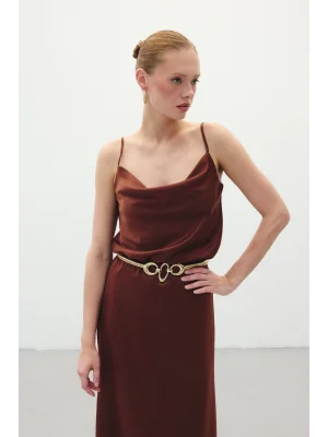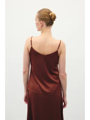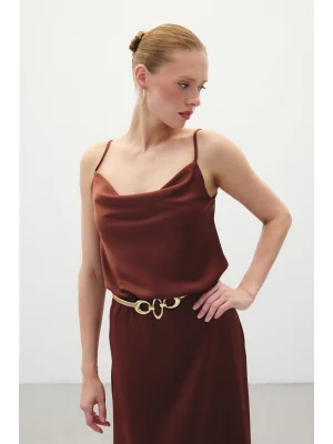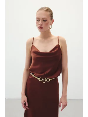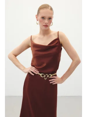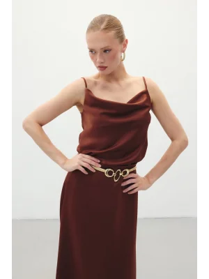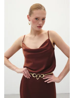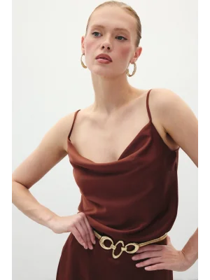 Degaje Yaka Saten Bluz - Kahve