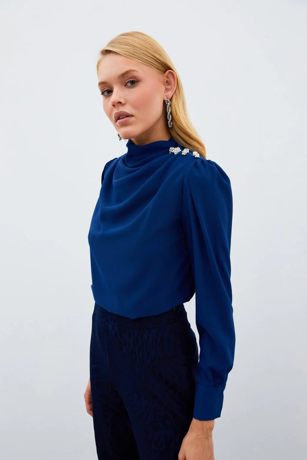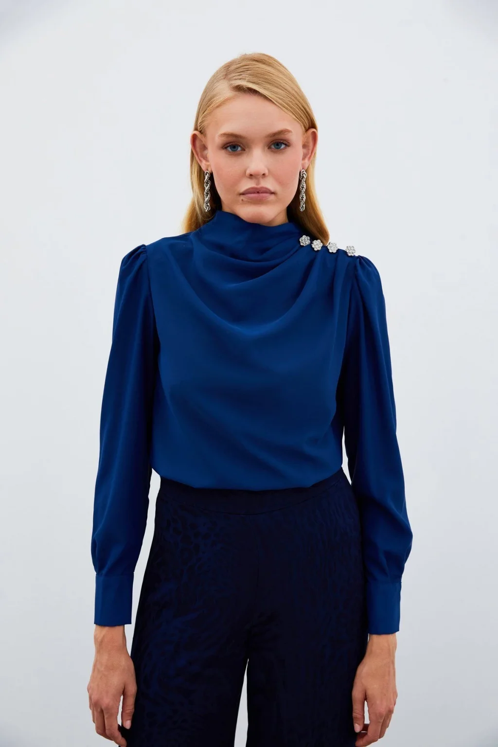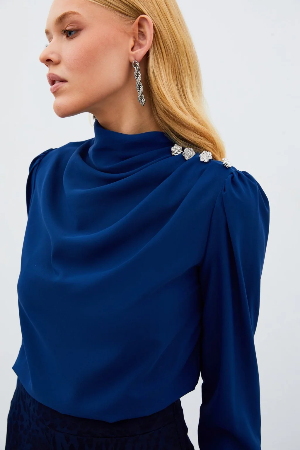 Drapeli yaka, uzun manşetleri düğme iliklemeli kol, süs zirkon taşlı salaş bluz.; Boy Uzunluğu: 61 cm Modelin Üzerindeki Ürün 36/S Bedendir.; Manken Ölçüleri Boy:1,75, Göğüs:84, Bel:65, Kalça:90