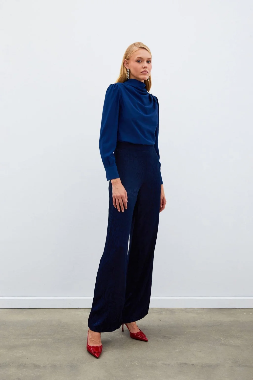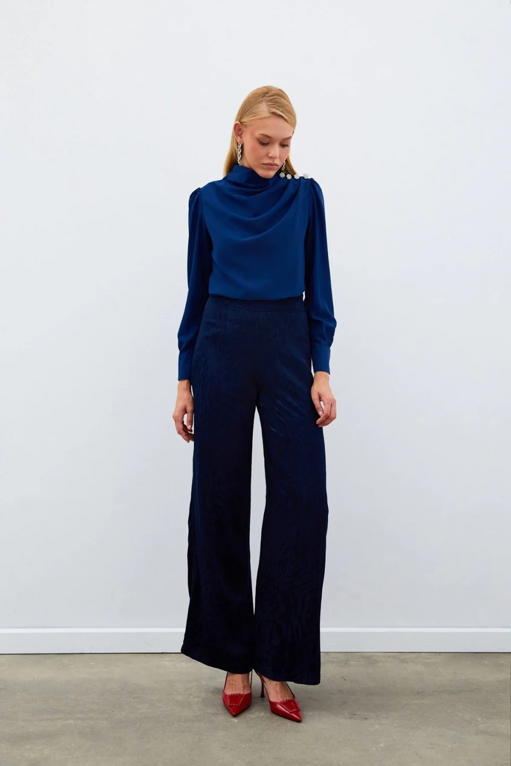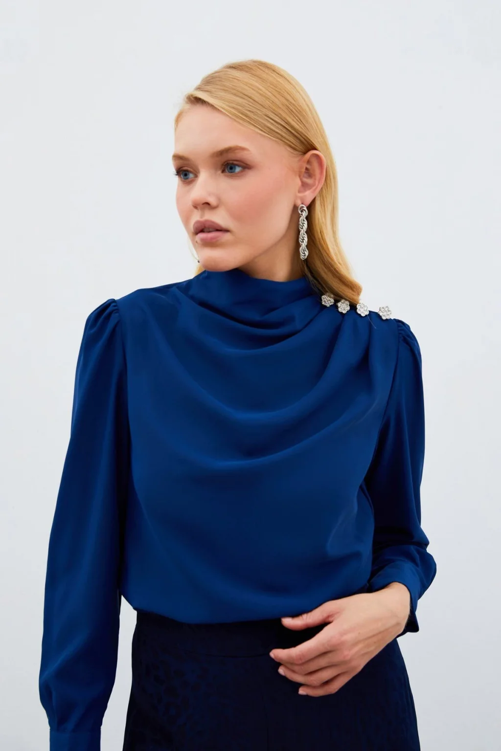 Drapeli yaka, uzun manşetleri düğme iliklemeli kol, süs zirkon taşlı salaş bluz.; Boy Uzunluğu: 61 cm Modelin Üzerindeki Ürün 36/S Bedendir.; Manken Ölçüleri Boy:1,75, Göğüs:84, Bel:65, Kalça:90