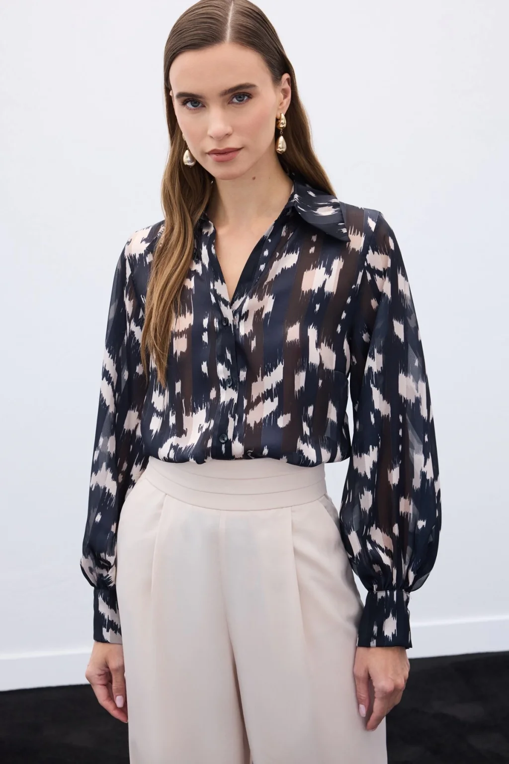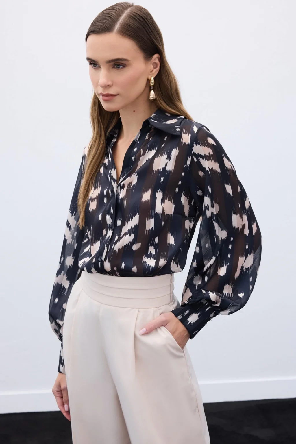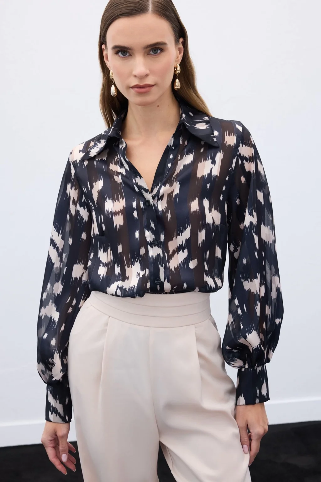 Geniş Manşetli Desenli Gömlek - Siyah
