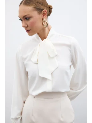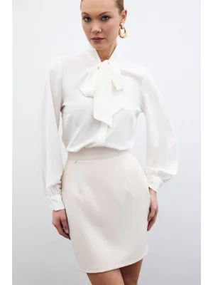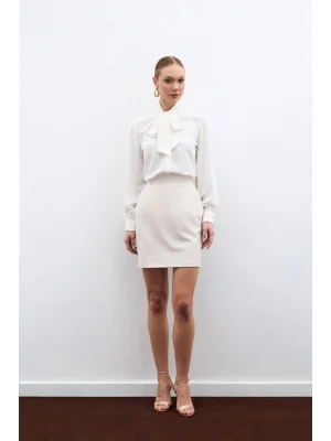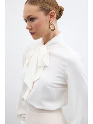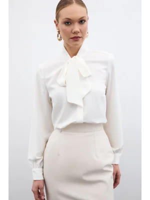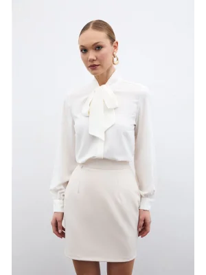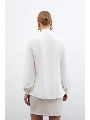Yakası Bağlamalı Düz Gömlek - Ekru