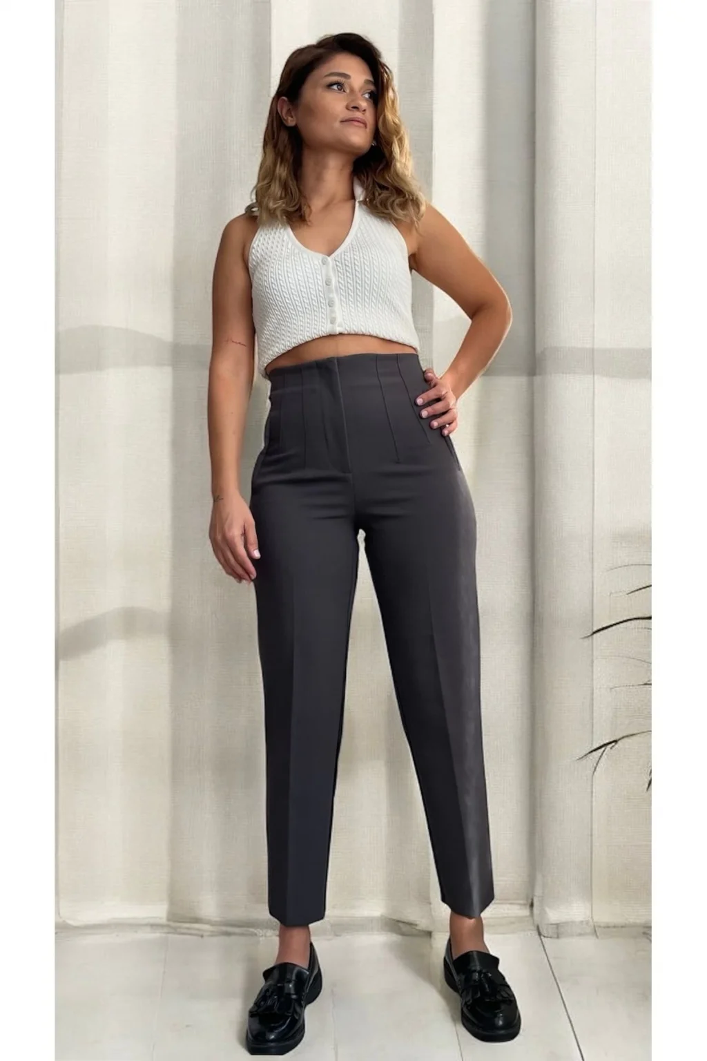 Karol kalitesiyle kumaş pantolonun keyfini sürün.; Önü filatolu, süper yüksek bel kumaş pantolon.