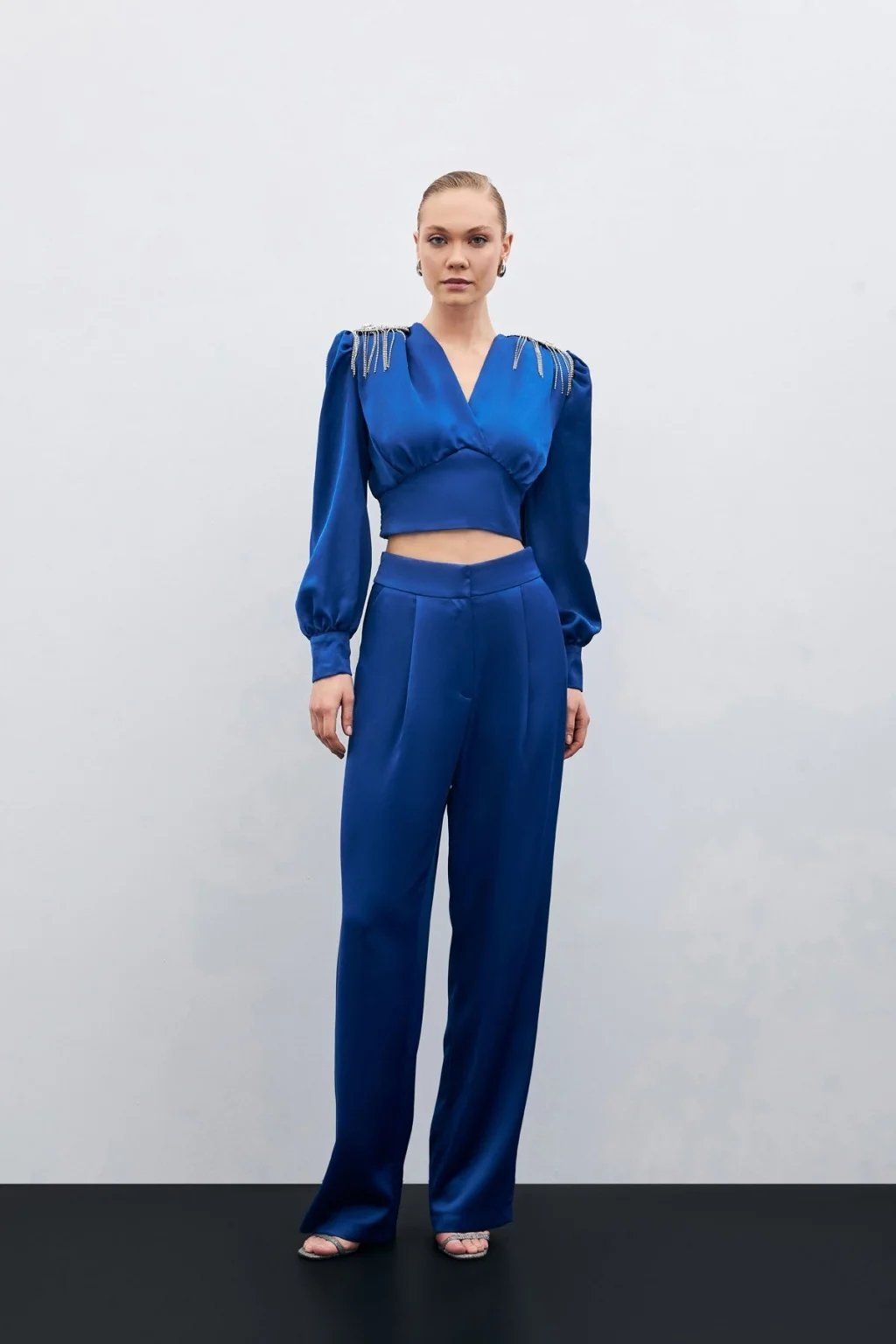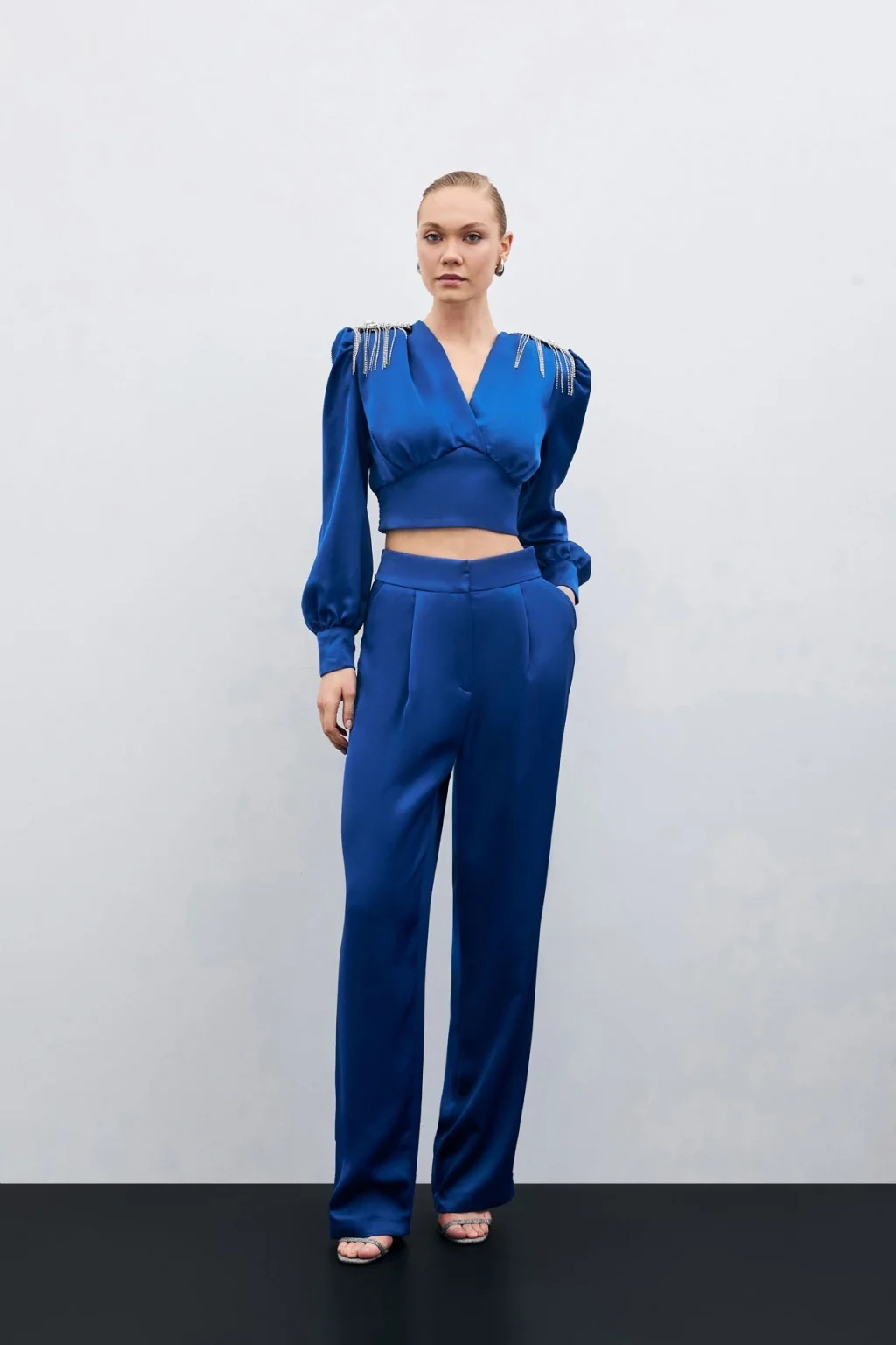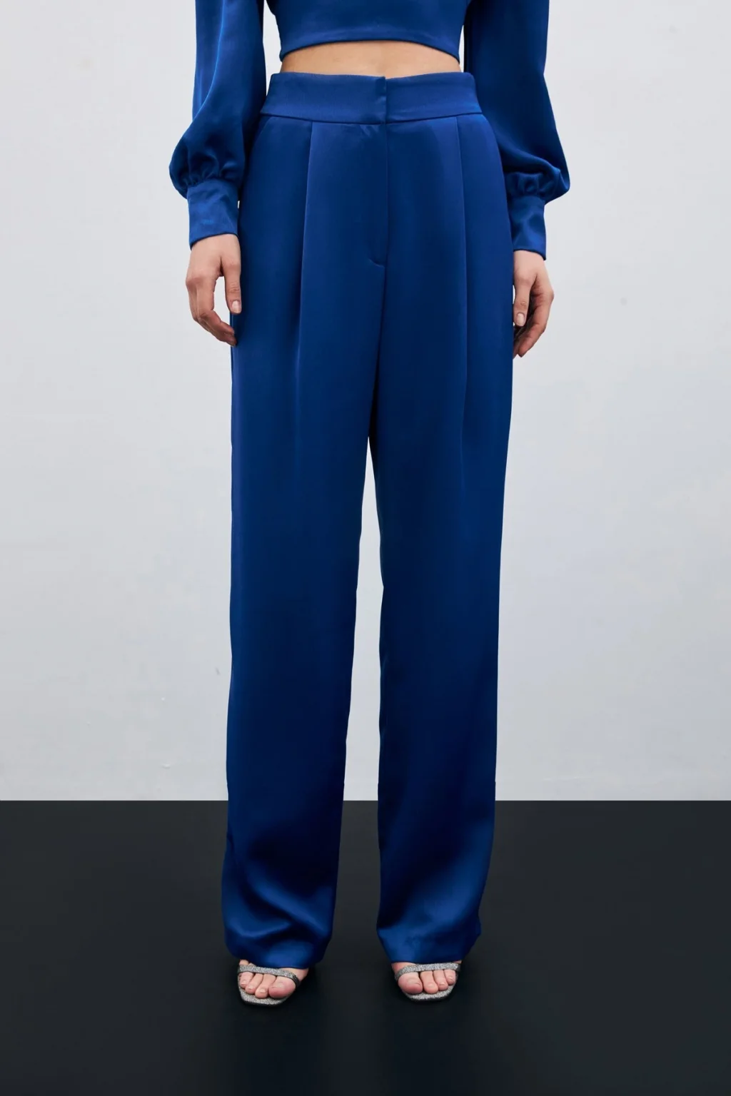Pileli Saten Krep Pantolon - İndigo