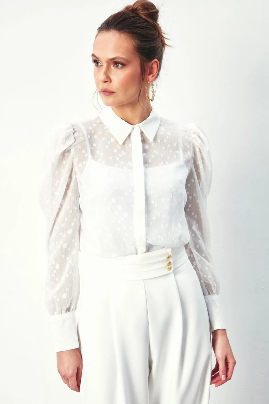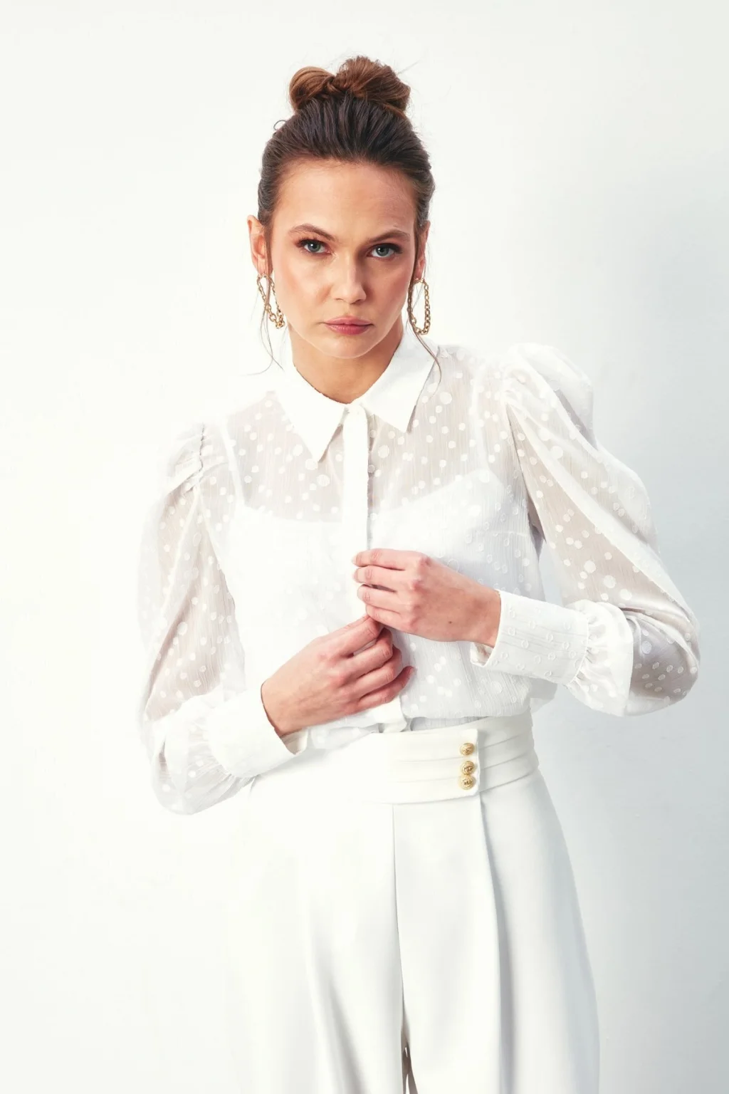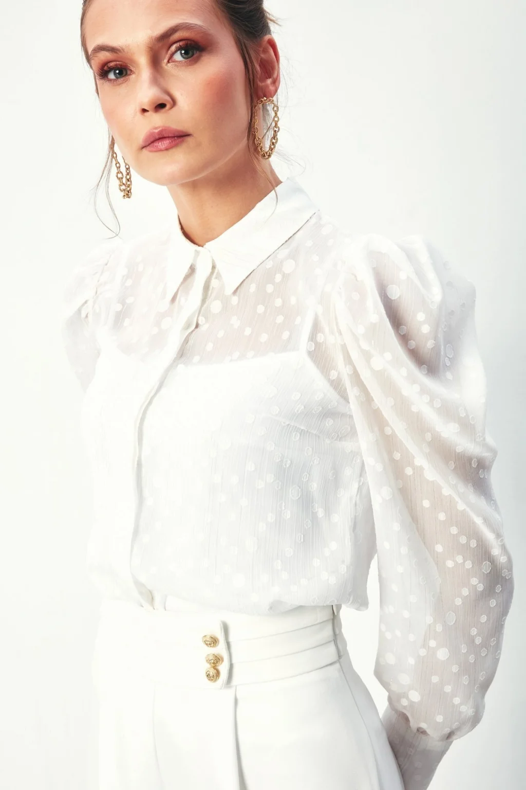 Puantiye Dokulu Gömlek - Ekru